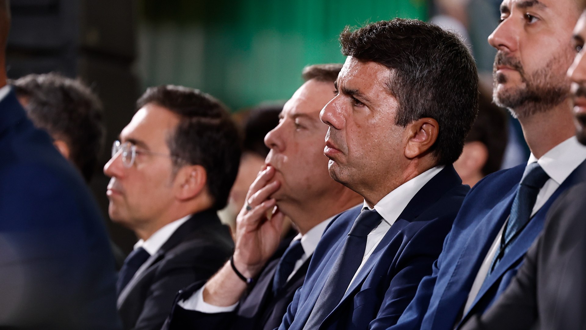 En la tercera fila, y en un puesto protocolario separado del resto de presidentes autonómicos, tenían su lugar Carlos Mazón, Emiliano García-Page y Juanma Moreno Bonilla, que finalmente no acudió. El presidente valenciano fue insultado por los familiares y también desde la calle cuando apareció en el saludo de recibimiento a don Felipe y doña Letizia a la entrada del Museo, en el que estuvo acompañado por la alcaldesa de Valencia, María José Catalá, y la delegada del Gobierno, Pilar Bernabé, además de Armengol, Rollán y Perelló. El presidente Sánchez se unió unos minutos antes de que lo hicieran los Reyes