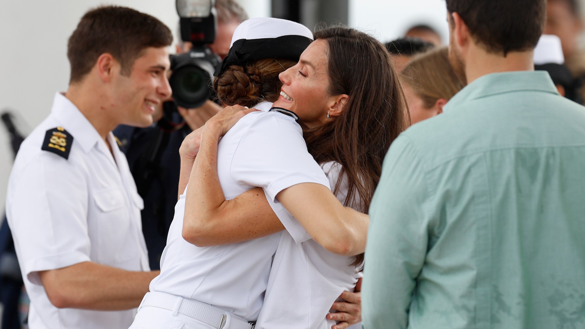 Doña Letizia iba ataviada con camiseta y pantalón blanco y ha saludado efusiva a los guardiamarinas desde el muelle. Su hija no ha podido esconder la ilusión por reunirse con su madre y, tras el protocolo castrense previo de cada llegada a puerto, la heredera y sus compañeros han seguido la orden de romper filas y han corrido a reunirse con sus familiares. Doña Letizia y Leonor se han dedicado varios abrazos seguidos y la reina ha comentado lo guapa que encontraba a su hija.