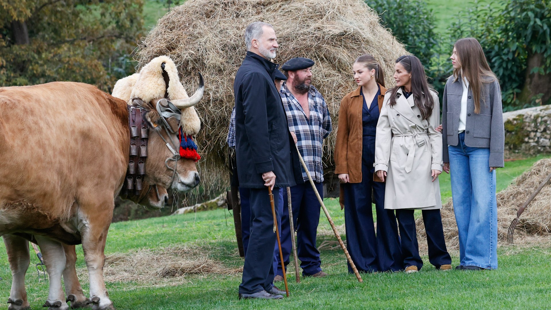 La casona de Leceña parecía preparada para un rodaje de época aguardando a la Familia Real, que llegó al pueblo con 20 minutos de retraso y acompañados por el ministro de Agricultura, Luis Planas. En esta propiedad, cada junio, los vecinos representan Valdesoto d'antañu, momento en el que se convierten en actores para recrear cómo se vivía hace un siglo en la aldea. Mujeres prensando manzanas para sidra, hombres jugando a los bolos, mulas cargando kilos de heno, elaboración de conservas de matanza en directo... Las labores de antaño se dieron cita en esta casona, donde se vio a la Princesa y la Infanta muy interesadas. La familia se rio con la representación de una comedia de los vecinos, Don Felipe se atrevió a jugar a los bolos asturianos y probó un culín de sidra.